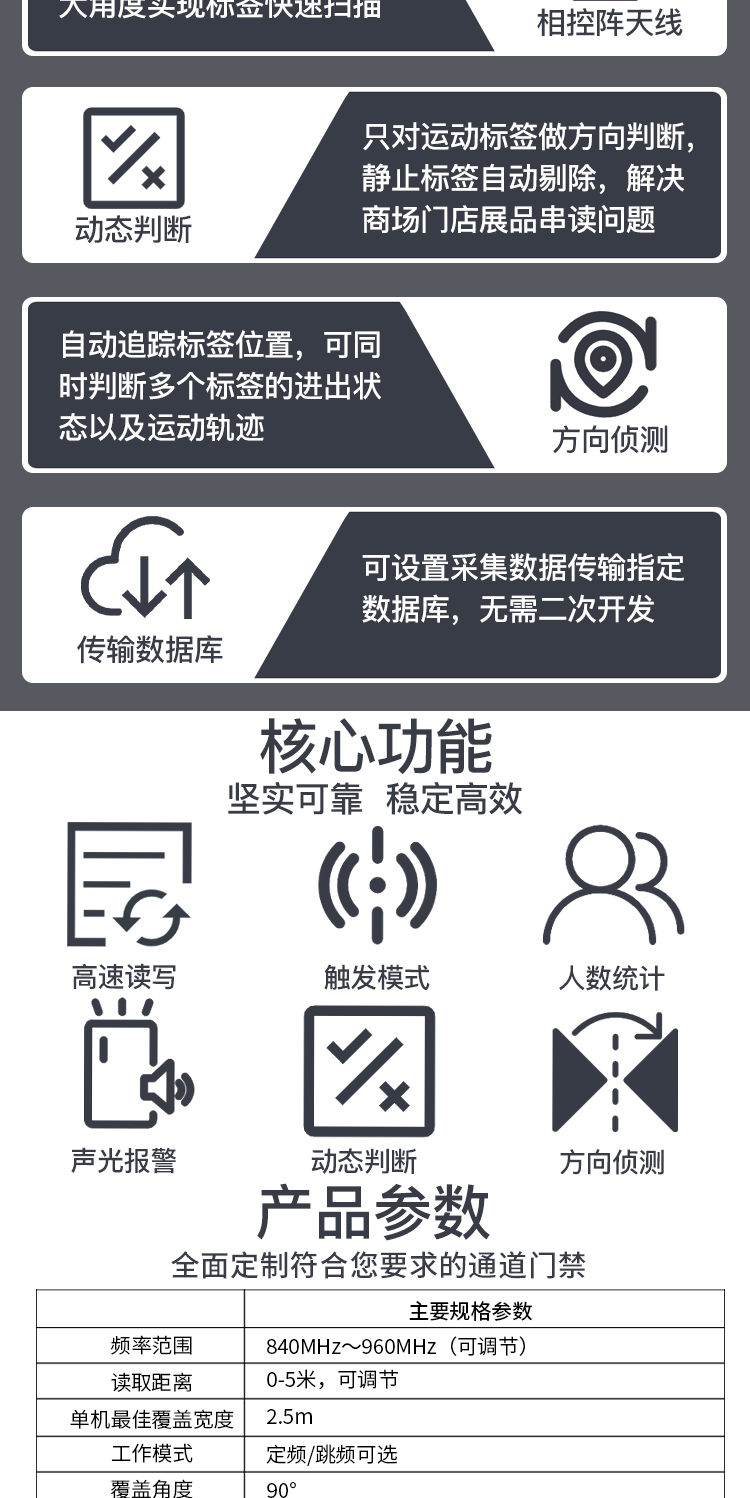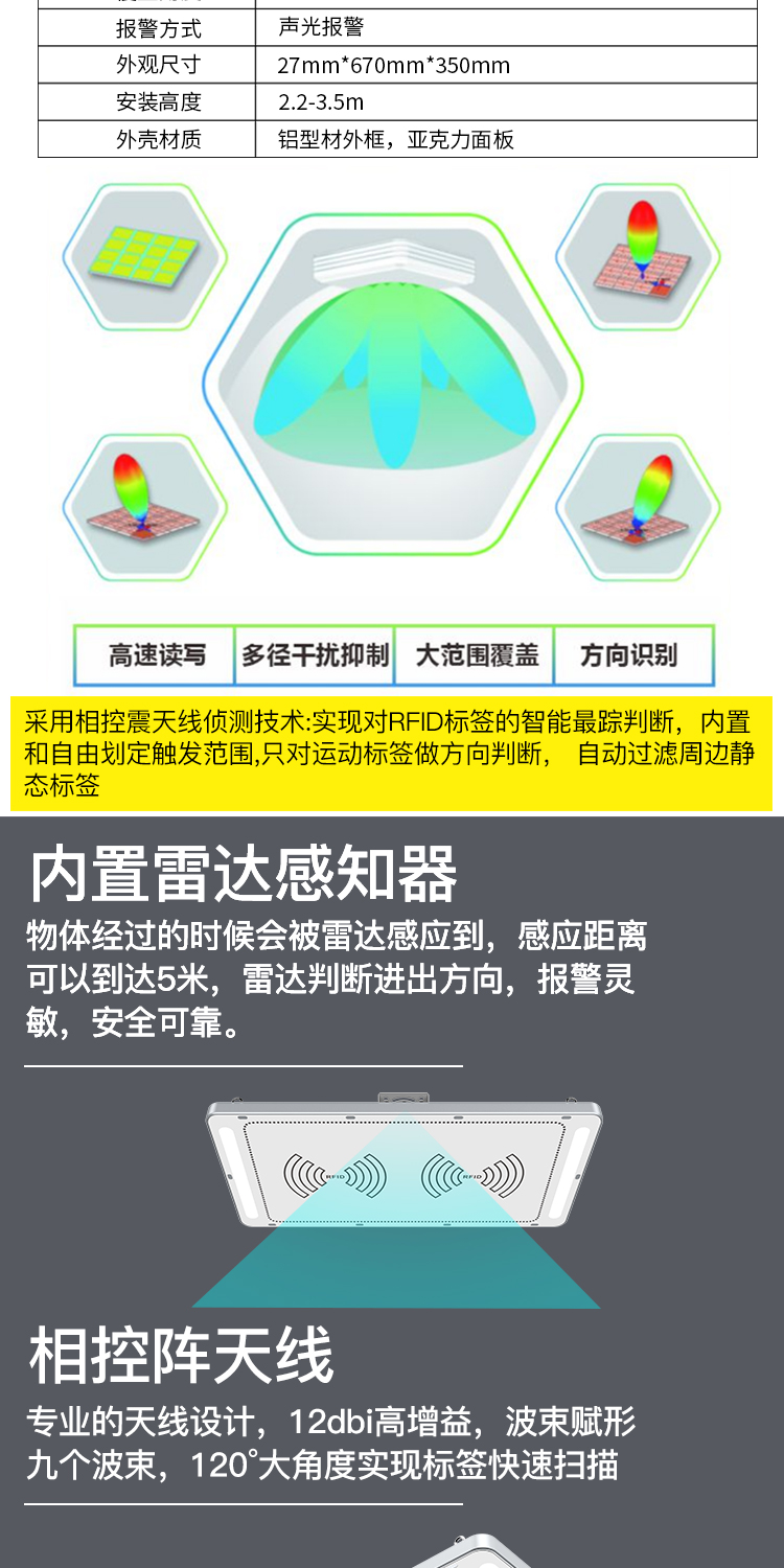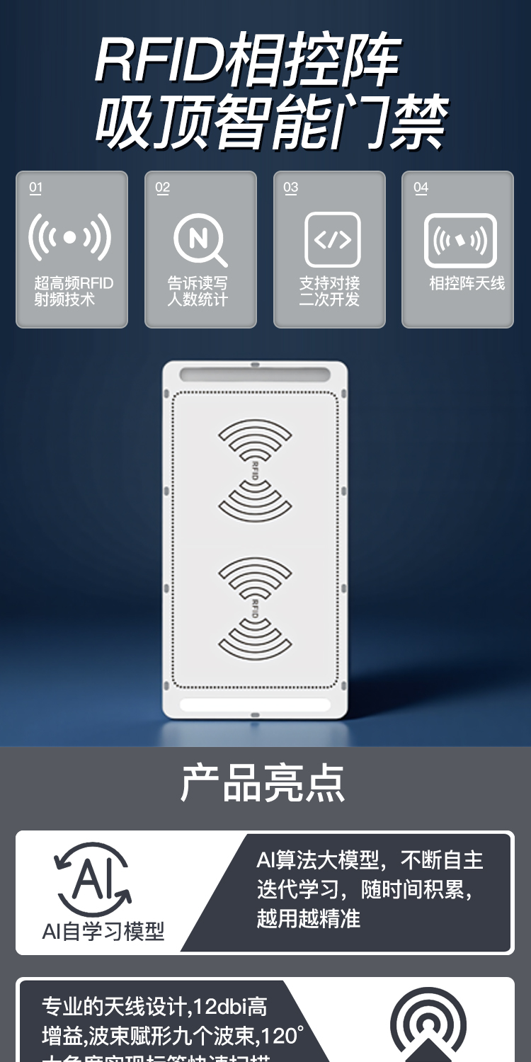 超高频RFID相控阵智能门禁批量识别实时数据同步追踪吸顶式通道门