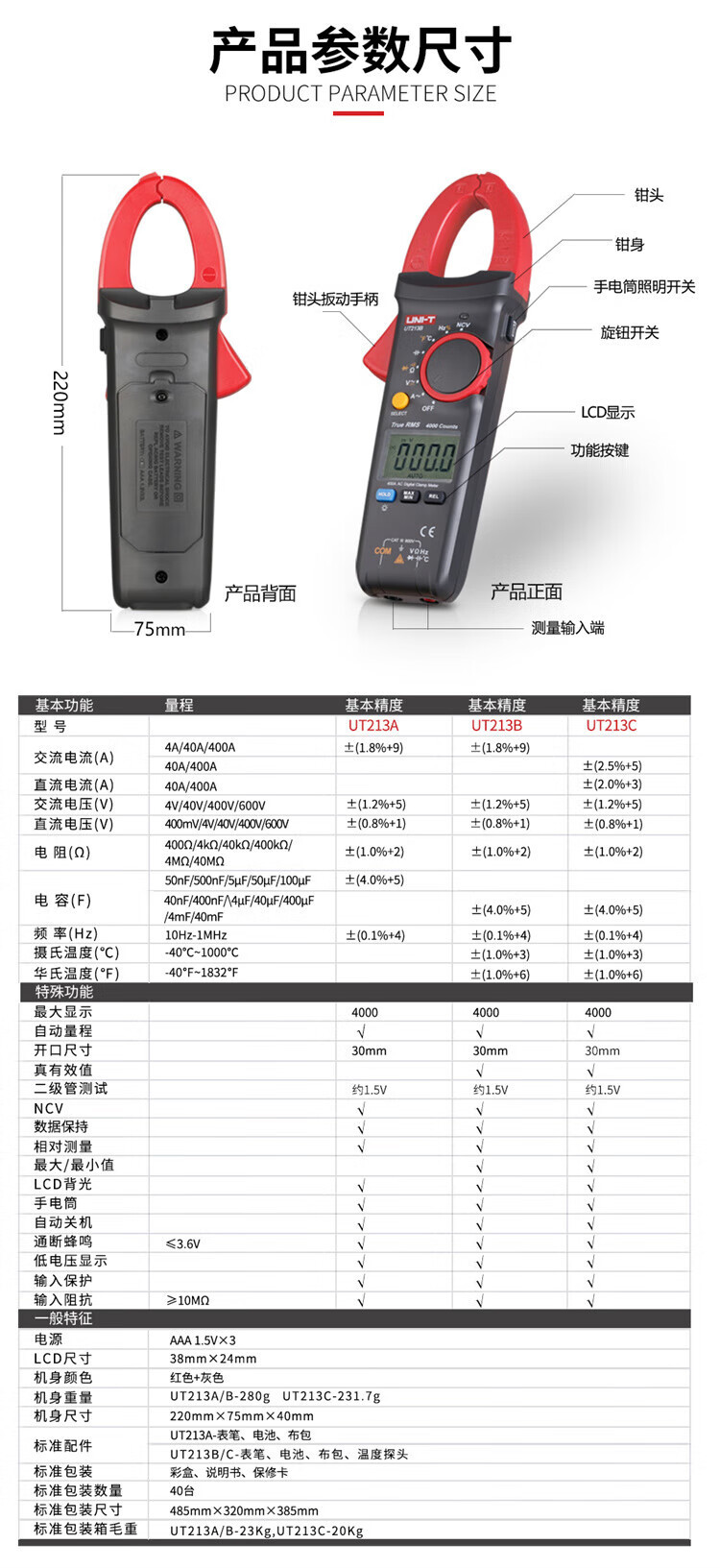优利德UT213A/213B/UT213C真有效值数字钳形表高精度万用表电流表