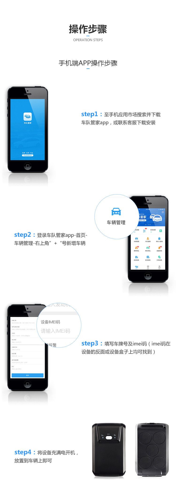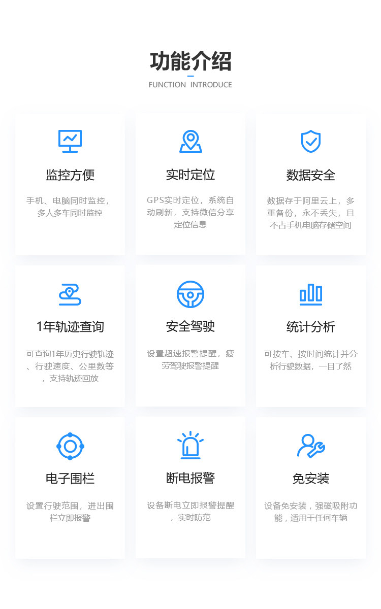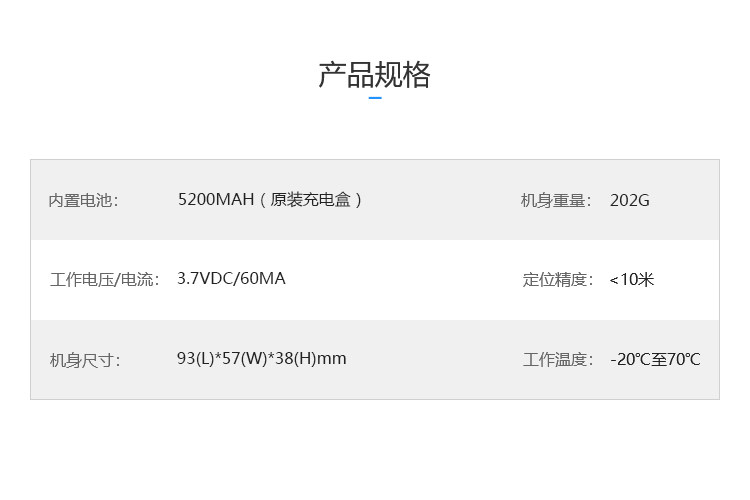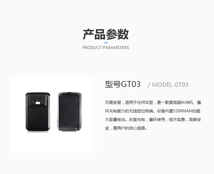 无需安装,适用于任何车型,是一款具有超长待机、循环充电能力的无线定位终端。设备内置5200mAh的超大容量电池;反复充电,循环使用,经济实惠;更有多种工作模式选择,智能切换,简单安全,是用户的放心直选。