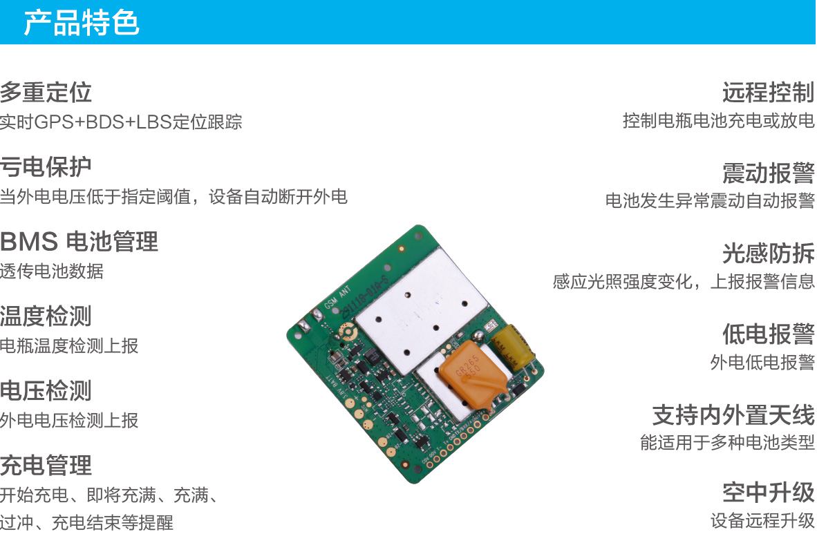 JM-E220通过双模定位并搭配多种报警机制,减少电池被盗风险,保护电池安全。同时,它连接BMS电池管理,具有温度检测、充电管理等功能,实现电池智能化管理,提高电池使用寿命。另外,它可嵌于各种形状的电池,可应用于智能换电等行业。