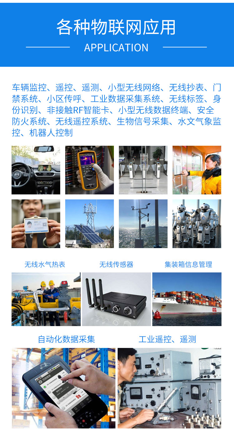 具备极低的3mA接收电流应用领域:无线抄表、泛在电力物联网、工业物联网、农业物联网、智慧城市、环境监测、无线通讯方面各种应用等。