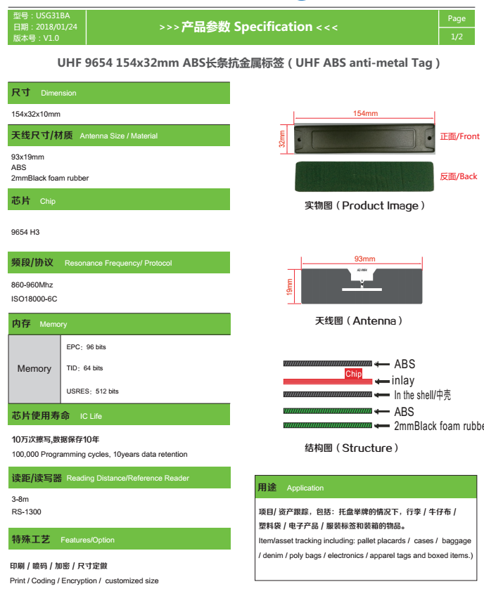 UHF (9654)ABS长条带海绵抗金属标签可应用于项目/资产跟踪,包括:托盘举牌的情况下,行李/牛仔布/塑料袋/电子产品/服装标签和装箱的物品等领域中。